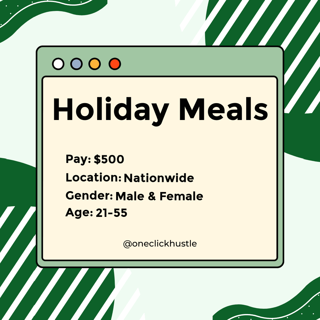 A market research company is conducting a research study on holiday meals paying $500. If chosen, you’ll have the opportunity to join an online discussion board taking place between 11/6 - 1/5. If you’re interested in participating in the study, simply take the survey below to determine if you qualify. The recruitment team will reach out to selected participants based on your responses.